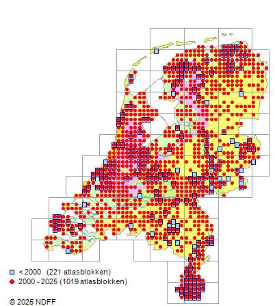 Het aantal atlasblokken (5x5 km) waarin de soort is gemeld binnen een periode van vijf jaar (vanaf 1980) of twintig jaar. Niet gecorrigeerd voor waarnemersinspanning en het aantal doorgegeven waarnemingen kan sterk variëren per periode, dus een trend in verspreiding kan hier niet direct uit worden afgelezen. Het opgegeven jaartal is het eerste jaar van de periode. Bron: gevalideerde waarnemingen uit de NDFF.