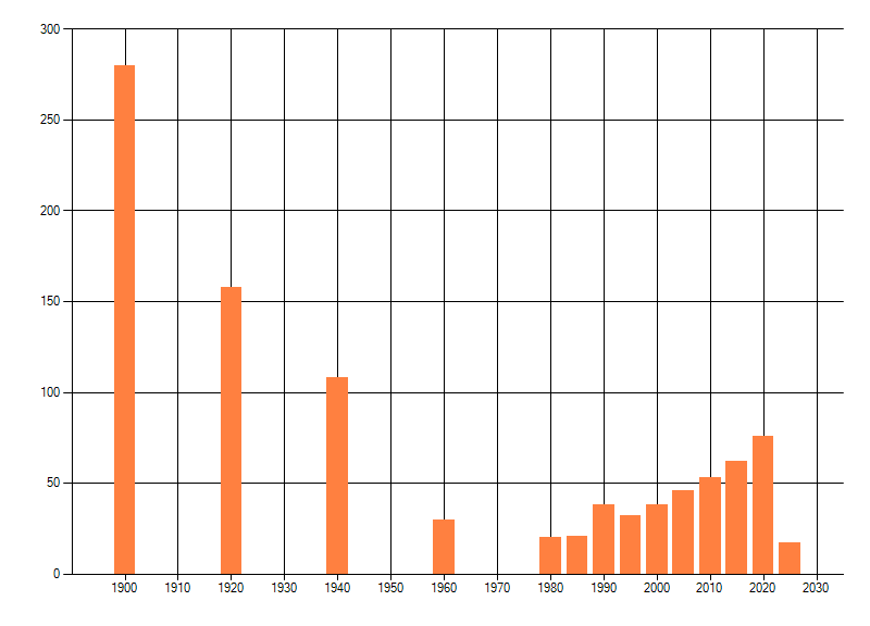 Het aantal atlasblokken (5x5 km) waarin de soort is gemeld binnen een periode van vijf jaar (vanaf 1980) of twintig jaar. Niet gecorrigeerd voor waarnemersinspanning en het aantal doorgegeven waarnemingen kan sterk variëren per periode, dus een trend in verspreiding kan hier niet direct uit worden afgelezen. Het opgegeven jaartal is het eerste jaar van de periode. Bron: gevalideerde waarnemingen uit de NDFF.