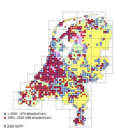 Het aantal atlasblokken (5x5 km) waarin de soort is gemeld binnen een periode van vijf jaar (vanaf 1980) of twintig jaar. Niet gecorrigeerd voor waarnemersinspanning en het aantal doorgegeven waarnemingen kan sterk variëren per periode, dus een trend in verspreiding kan hier niet direct uit worden afgelezen. Het opgegeven jaartal is het eerste jaar van de periode. Bron: gevalideerde waarnemingen uit de NDFF.