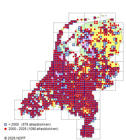 Het aantal atlasblokken (5x5 km) waarin de soort is gemeld binnen een periode van vijf jaar (vanaf 1980) of twintig jaar. Niet gecorrigeerd voor waarnemersinspanning en het aantal doorgegeven waarnemingen kan sterk variëren per periode, dus een trend in verspreiding kan hier niet direct uit worden afgelezen. Het opgegeven jaartal is het eerste jaar van de periode. Bron: gevalideerde waarnemingen uit de NDFF.