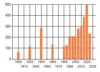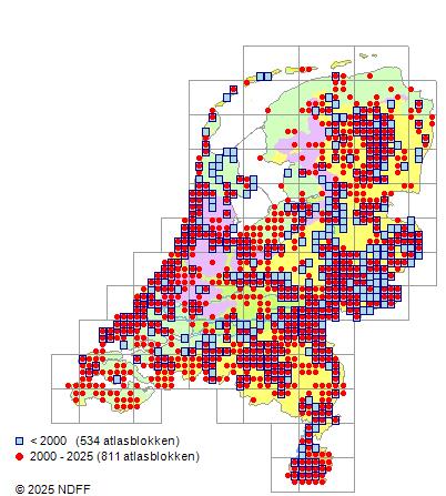 Het aantal atlasblokken (5x5 km) waarin de soort is gemeld binnen een periode van vijf jaar (vanaf 1980) of twintig jaar. Niet gecorrigeerd voor waarnemersinspanning en het aantal doorgegeven waarnemingen kan sterk variëren per periode, dus een trend in verspreiding kan hier niet direct uit worden afgelezen. Het opgegeven jaartal is het eerste jaar van de periode. Bron: gevalideerde waarnemingen uit de NDFF.