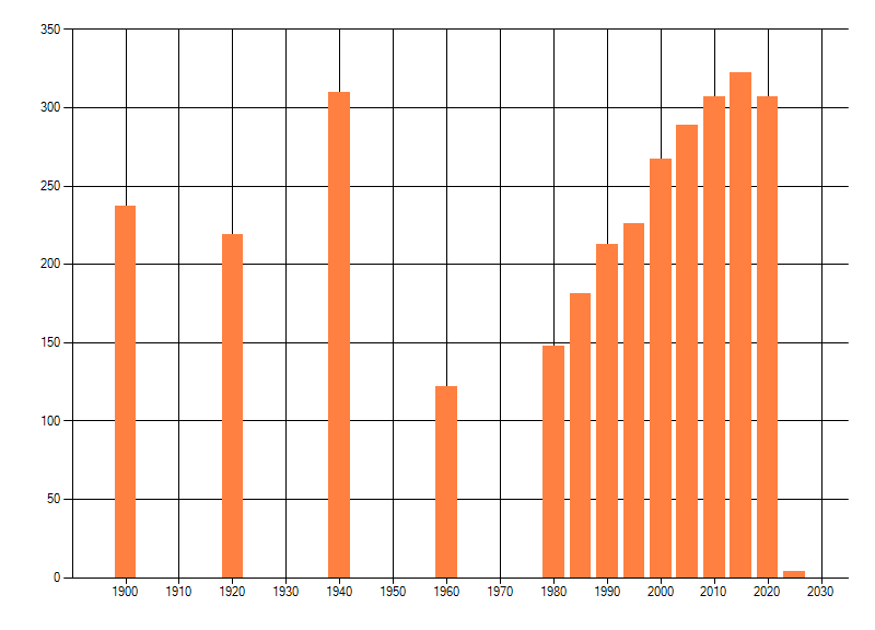 Het aantal atlasblokken (5x5 km) waarin de soort is gemeld binnen een periode van vijf jaar (vanaf 1980) of twintig jaar. Niet gecorrigeerd voor waarnemersinspanning en het aantal doorgegeven waarnemingen kan sterk variëren per periode, dus een trend in verspreiding kan hier niet direct uit worden afgelezen. Het opgegeven jaartal is het eerste jaar van de periode. Bron: gevalideerde waarnemingen uit de NDFF.
