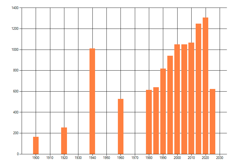 Het aantal atlasblokken (5x5 km) waarin de soort is gemeld binnen een periode van vijf jaar (vanaf 1980) of twintig jaar. Niet gecorrigeerd voor waarnemersinspanning en het aantal doorgegeven waarnemingen kan sterk variëren per periode, dus een trend in verspreiding kan hier niet direct uit worden afgelezen. Het opgegeven jaartal is het eerste jaar van de periode. Bron: gevalideerde waarnemingen uit de NDFF.