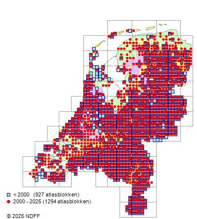 Het aantal atlasblokken (5x5 km) waarin de soort is gemeld binnen een periode van vijf jaar (vanaf 1980) of twintig jaar. Niet gecorrigeerd voor waarnemersinspanning en het aantal doorgegeven waarnemingen kan sterk variëren per periode, dus een trend in verspreiding kan hier niet direct uit worden afgelezen. Het opgegeven jaartal is het eerste jaar van de periode. Bron: gevalideerde waarnemingen uit de NDFF.