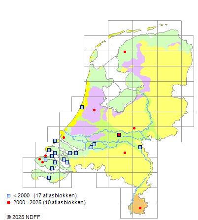 Het aantal atlasblokken (5x5 km) waarin de soort is gemeld binnen een periode van vijf jaar (vanaf 1980) of twintig jaar. Niet gecorrigeerd voor waarnemersinspanning en het aantal doorgegeven waarnemingen kan sterk variëren per periode, dus een trend in verspreiding kan hier niet direct uit worden afgelezen. Het opgegeven jaartal is het eerste jaar van de periode. Bron: gevalideerde waarnemingen uit de NDFF.