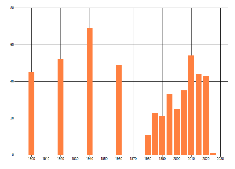 Het aantal atlasblokken (5x5 km) waarin de soort is gemeld binnen een periode van vijf jaar (vanaf 1980) of twintig jaar. Niet gecorrigeerd voor waarnemersinspanning en het aantal doorgegeven waarnemingen kan sterk variëren per periode, dus een trend in verspreiding kan hier niet direct uit worden afgelezen. Het opgegeven jaartal is het eerste jaar van de periode. Bron: gevalideerde waarnemingen uit de NDFF.