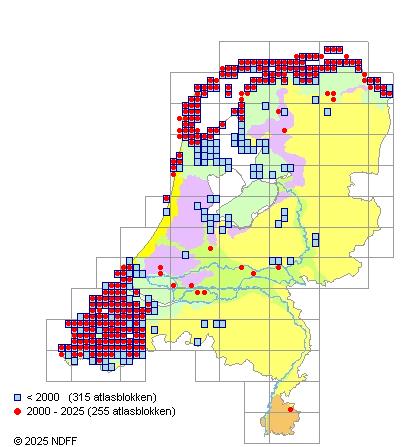 Het aantal atlasblokken (5x5 km) waarin de soort is gemeld binnen een periode van vijf jaar (vanaf 1980) of twintig jaar. Niet gecorrigeerd voor waarnemersinspanning en het aantal doorgegeven waarnemingen kan sterk variëren per periode, dus een trend in verspreiding kan hier niet direct uit worden afgelezen. Het opgegeven jaartal is het eerste jaar van de periode. Bron: gevalideerde waarnemingen uit de NDFF.