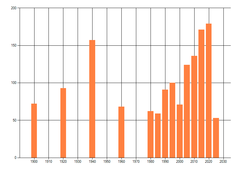 Het aantal atlasblokken (5x5 km) waarin de soort is gemeld binnen een periode van vijf jaar (vanaf 1980) of twintig jaar. Niet gecorrigeerd voor waarnemersinspanning en het aantal doorgegeven waarnemingen kan sterk variƫren per periode, dus een trend in verspreiding kan hier niet direct uit worden afgelezen. Het opgegeven jaartal is het eerste jaar van de periode. Bron: gevalideerde waarnemingen uit de NDFF.