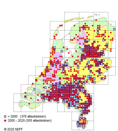 Het aantal atlasblokken (5x5 km) waarin de soort is gemeld binnen een periode van vijf jaar (vanaf 1980) of twintig jaar. Niet gecorrigeerd voor waarnemersinspanning en het aantal doorgegeven waarnemingen kan sterk variëren per periode, dus een trend in verspreiding kan hier niet direct uit worden afgelezen. Het opgegeven jaartal is het eerste jaar van de periode. Bron: gevalideerde waarnemingen uit de NDFF.