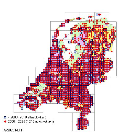 Het aantal atlasblokken (5x5 km) waarin de soort is gemeld binnen een periode van vijf jaar (vanaf 1980) of twintig jaar. Niet gecorrigeerd voor waarnemersinspanning en het aantal doorgegeven waarnemingen kan sterk variëren per periode, dus een trend in verspreiding kan hier niet direct uit worden afgelezen. Het opgegeven jaartal is het eerste jaar van de periode. Bron: gevalideerde waarnemingen uit de NDFF.