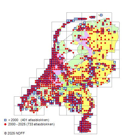 Het aantal atlasblokken (5x5 km) waarin de soort is gemeld binnen een periode van vijf jaar (vanaf 1980) of twintig jaar. Niet gecorrigeerd voor waarnemersinspanning en het aantal doorgegeven waarnemingen kan sterk variëren per periode, dus een trend in verspreiding kan hier niet direct uit worden afgelezen. Het opgegeven jaartal is het eerste jaar van de periode. Bron: gevalideerde waarnemingen uit de NDFF.