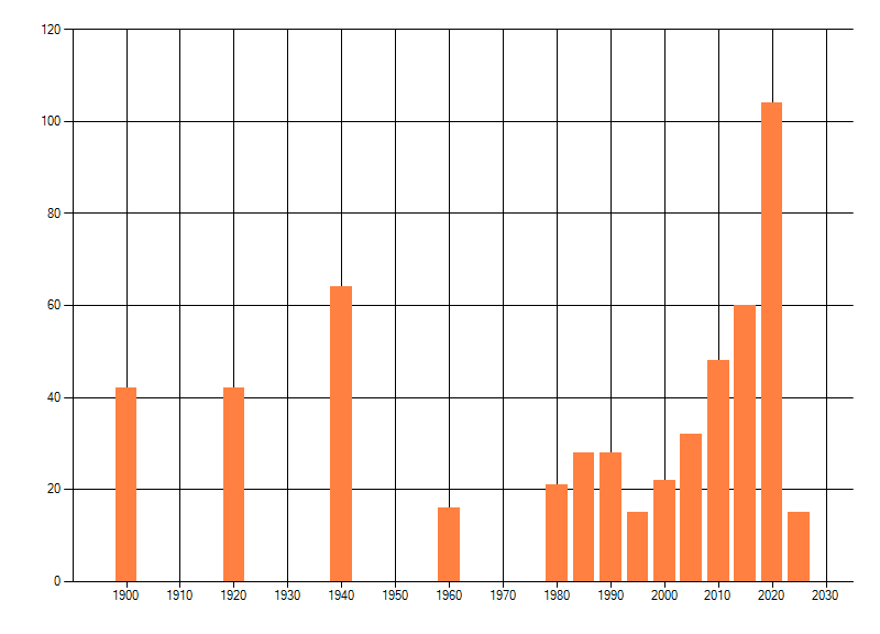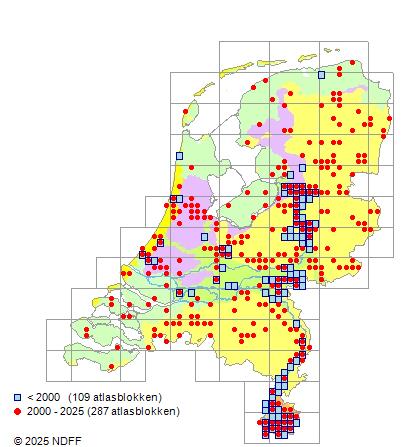 Het aantal atlasblokken (5x5 km) waarin de soort is gemeld binnen een periode van vijf jaar (vanaf 1980) of twintig jaar. Niet gecorrigeerd voor waarnemersinspanning en het aantal doorgegeven waarnemingen kan sterk variëren per periode, dus een trend in verspreiding kan hier niet direct uit worden afgelezen. Het opgegeven jaartal is het eerste jaar van de periode. Bron: gevalideerde waarnemingen uit de NDFF.