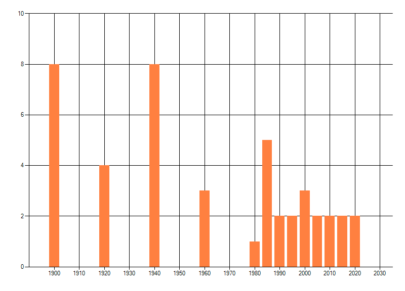 Het aantal atlasblokken (5x5 km) waarin de soort is gemeld binnen een periode van vijf jaar (vanaf 1980) of twintig jaar. Niet gecorrigeerd voor waarnemersinspanning en het aantal doorgegeven waarnemingen kan sterk variëren per periode, dus een trend in verspreiding kan hier niet direct uit worden afgelezen. Het opgegeven jaartal is het eerste jaar van de periode. Bron: gevalideerde waarnemingen uit de NDFF.