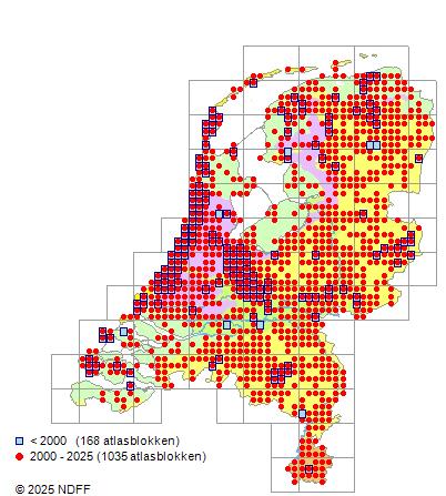 Het aantal atlasblokken (5x5 km) waarin de soort is gemeld binnen een periode van vijf jaar (vanaf 1980) of twintig jaar. Niet gecorrigeerd voor waarnemersinspanning en het aantal doorgegeven waarnemingen kan sterk variëren per periode, dus een trend in verspreiding kan hier niet direct uit worden afgelezen. Het opgegeven jaartal is het eerste jaar van de periode. Bron: gevalideerde waarnemingen uit de NDFF.