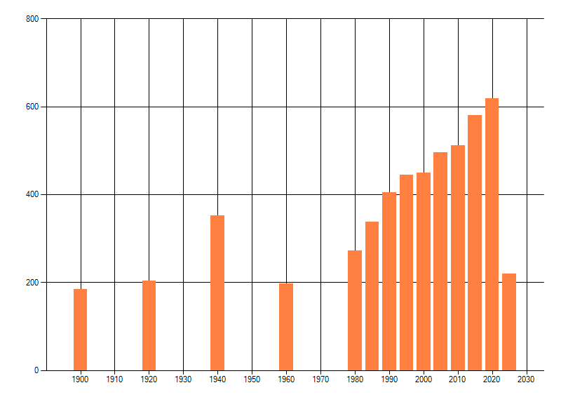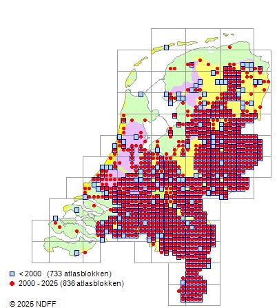 Het aantal atlasblokken (5x5 km) waarin de soort is gemeld binnen een periode van vijf jaar (vanaf 1980) of twintig jaar. Niet gecorrigeerd voor waarnemersinspanning en het aantal doorgegeven waarnemingen kan sterk variëren per periode, dus een trend in verspreiding kan hier niet direct uit worden afgelezen. Het opgegeven jaartal is het eerste jaar van de periode. Bron: gevalideerde waarnemingen uit de NDFF.