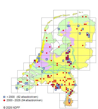 Het aantal atlasblokken (5x5 km) waarin de soort is gemeld binnen een periode van vijf jaar (vanaf 1980) of twintig jaar. Niet gecorrigeerd voor waarnemersinspanning en het aantal doorgegeven waarnemingen kan sterk variëren per periode, dus een trend in verspreiding kan hier niet direct uit worden afgelezen. Het opgegeven jaartal is het eerste jaar van de periode. Bron: gevalideerde waarnemingen uit de NDFF.