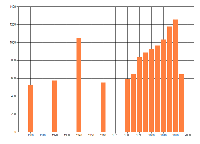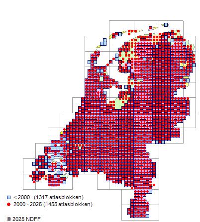 Het aantal atlasblokken (5x5 km) waarin de soort is gemeld binnen een periode van vijf jaar (vanaf 1980) of twintig jaar. Niet gecorrigeerd voor waarnemersinspanning en het aantal doorgegeven waarnemingen kan sterk variëren per periode, dus een trend in verspreiding kan hier niet direct uit worden afgelezen. Het opgegeven jaartal is het eerste jaar van de periode. Bron: gevalideerde waarnemingen uit de NDFF.