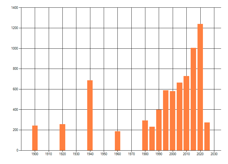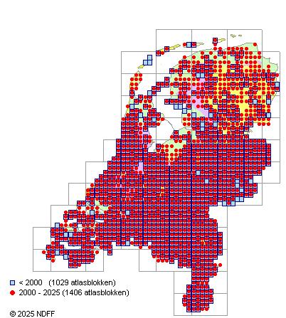Het aantal atlasblokken (5x5 km) waarin de soort is gemeld binnen een periode van vijf jaar (vanaf 1980) of twintig jaar. Niet gecorrigeerd voor waarnemersinspanning en het aantal doorgegeven waarnemingen kan sterk variëren per periode, dus een trend in verspreiding kan hier niet direct uit worden afgelezen. Het opgegeven jaartal is het eerste jaar van de periode. Bron: gevalideerde waarnemingen uit de NDFF.