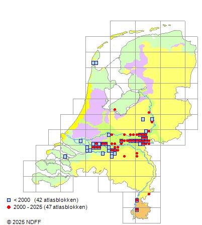 Het aantal atlasblokken (5x5 km) waarin de soort is gemeld binnen een periode van vijf jaar (vanaf 1980) of twintig jaar. Niet gecorrigeerd voor waarnemersinspanning en het aantal doorgegeven waarnemingen kan sterk variëren per periode, dus een trend in verspreiding kan hier niet direct uit worden afgelezen. Het opgegeven jaartal is het eerste jaar van de periode. Bron: gevalideerde waarnemingen uit de NDFF.