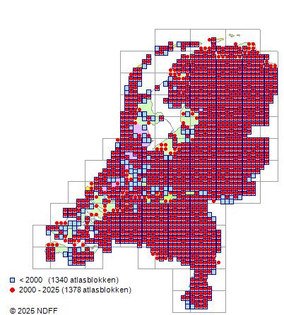 Het aantal atlasblokken (5x5 km) waarin de soort is gemeld binnen een periode van vijf jaar (vanaf 1980) of twintig jaar. Niet gecorrigeerd voor waarnemersinspanning en het aantal doorgegeven waarnemingen kan sterk variëren per periode, dus een trend in verspreiding kan hier niet direct uit worden afgelezen. Het opgegeven jaartal is het eerste jaar van de periode. Bron: gevalideerde waarnemingen uit de NDFF.