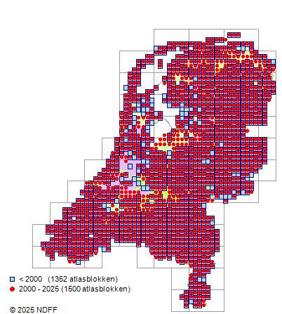 Het aantal atlasblokken (5x5 km) waarin de soort is gemeld binnen een periode van vijf jaar (vanaf 1980) of twintig jaar. Niet gecorrigeerd voor waarnemersinspanning en het aantal doorgegeven waarnemingen kan sterk variëren per periode, dus een trend in verspreiding kan hier niet direct uit worden afgelezen. Het opgegeven jaartal is het eerste jaar van de periode. Bron: gevalideerde waarnemingen uit de NDFF.