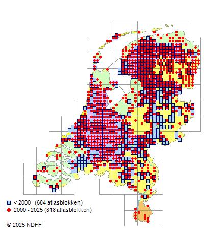 Het aantal atlasblokken (5x5 km) waarin de soort is gemeld binnen een periode van vijf jaar (vanaf 1980) of twintig jaar. Niet gecorrigeerd voor waarnemersinspanning en het aantal doorgegeven waarnemingen kan sterk variëren per periode, dus een trend in verspreiding kan hier niet direct uit worden afgelezen. Het opgegeven jaartal is het eerste jaar van de periode. Bron: gevalideerde waarnemingen uit de NDFF.