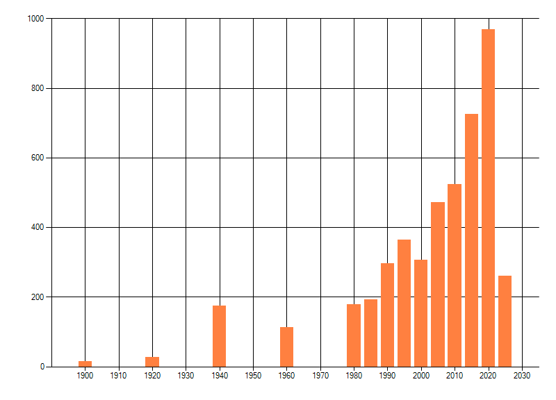 Het aantal atlasblokken (5x5 km) waarin de soort is gemeld binnen een periode van vijf jaar (vanaf 1980) of twintig jaar. Niet gecorrigeerd voor waarnemersinspanning en het aantal doorgegeven waarnemingen kan sterk variëren per periode, dus een trend in verspreiding kan hier niet direct uit worden afgelezen. Het opgegeven jaartal is het eerste jaar van de periode. Bron: gevalideerde waarnemingen uit de NDFF.