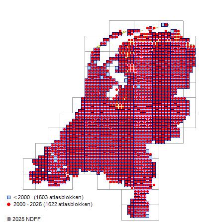 Het aantal atlasblokken (5x5 km) waarin de soort is gemeld binnen een periode van vijf jaar (vanaf 1980) of twintig jaar. Niet gecorrigeerd voor waarnemersinspanning en het aantal doorgegeven waarnemingen kan sterk variëren per periode, dus een trend in verspreiding kan hier niet direct uit worden afgelezen. Het opgegeven jaartal is het eerste jaar van de periode. Bron: gevalideerde waarnemingen uit de NDFF.