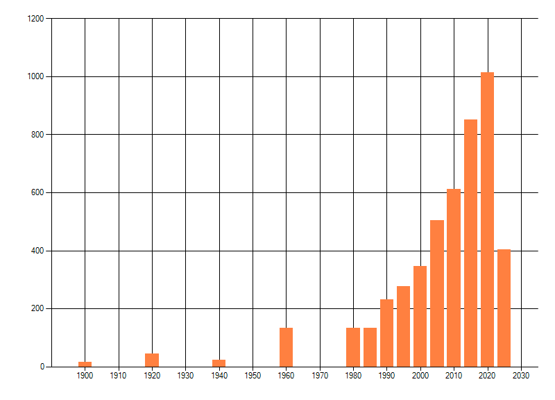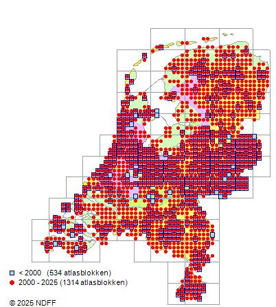 Het aantal atlasblokken (5x5 km) waarin de soort is gemeld binnen een periode van vijf jaar (vanaf 1980) of twintig jaar. Niet gecorrigeerd voor waarnemersinspanning en het aantal doorgegeven waarnemingen kan sterk variëren per periode, dus een trend in verspreiding kan hier niet direct uit worden afgelezen. Het opgegeven jaartal is het eerste jaar van de periode. Bron: gevalideerde waarnemingen uit de NDFF.