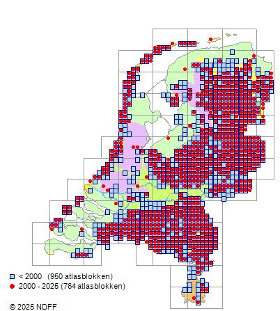 Het aantal atlasblokken (5x5 km) waarin de soort is gemeld binnen een periode van vijf jaar (vanaf 1980) of twintig jaar. Niet gecorrigeerd voor waarnemersinspanning en het aantal doorgegeven waarnemingen kan sterk variƫren per periode, dus een trend in verspreiding kan hier niet direct uit worden afgelezen. Het opgegeven jaartal is het eerste jaar van de periode. Bron: gevalideerde waarnemingen uit de NDFF.