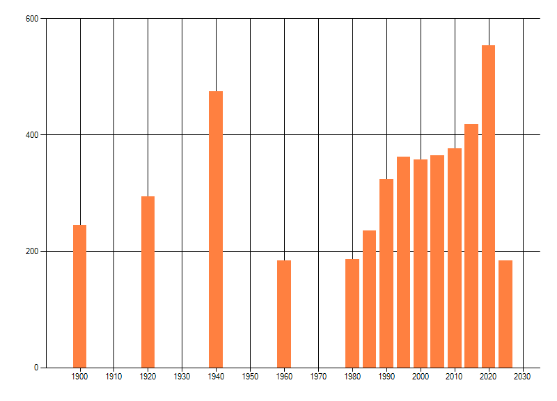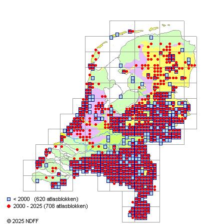 Het aantal atlasblokken (5x5 km) waarin de soort is gemeld binnen een periode van vijf jaar (vanaf 1980) of twintig jaar. Niet gecorrigeerd voor waarnemersinspanning en het aantal doorgegeven waarnemingen kan sterk variëren per periode, dus een trend in verspreiding kan hier niet direct uit worden afgelezen. Het opgegeven jaartal is het eerste jaar van de periode. Bron: gevalideerde waarnemingen uit de NDFF.