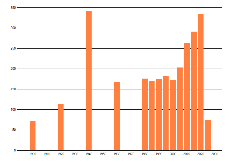 Het aantal atlasblokken (5x5 km) waarin de soort is gemeld binnen een periode van vijf jaar (vanaf 1980) of twintig jaar. Niet gecorrigeerd voor waarnemersinspanning en het aantal doorgegeven waarnemingen kan sterk variƫren per periode, dus een trend in verspreiding kan hier niet direct uit worden afgelezen. Het opgegeven jaartal is het eerste jaar van de periode. Bron: gevalideerde waarnemingen uit de NDFF.