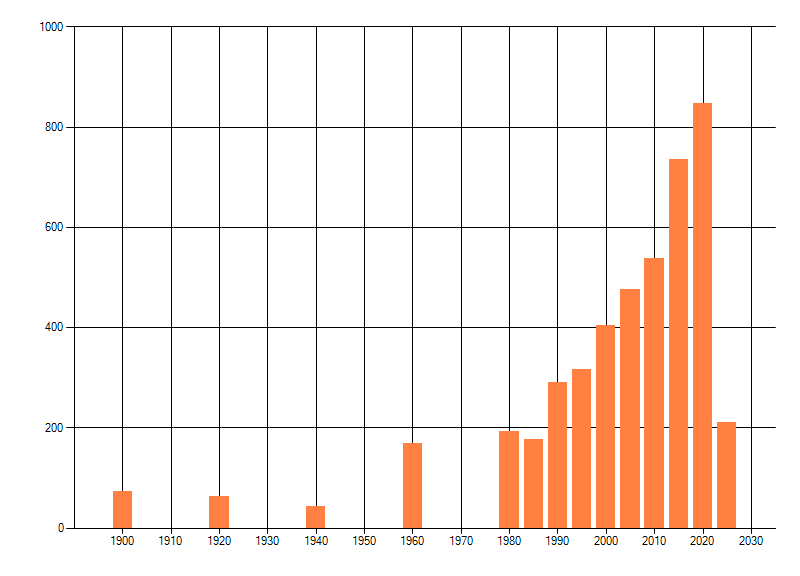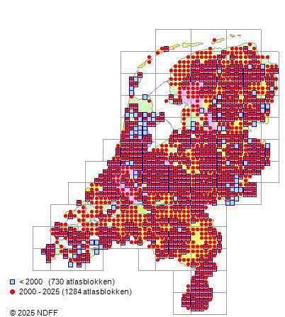 Het aantal atlasblokken (5x5 km) waarin de soort is gemeld binnen een periode van vijf jaar (vanaf 1980) of twintig jaar. Niet gecorrigeerd voor waarnemersinspanning en het aantal doorgegeven waarnemingen kan sterk variƫren per periode, dus een trend in verspreiding kan hier niet direct uit worden afgelezen. Het opgegeven jaartal is het eerste jaar van de periode. Bron: gevalideerde waarnemingen uit de NDFF.