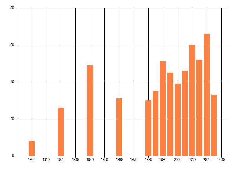 Het aantal atlasblokken (5x5 km) waarin de soort is gemeld binnen een periode van vijf jaar (vanaf 1980) of twintig jaar. Niet gecorrigeerd voor waarnemersinspanning en het aantal doorgegeven waarnemingen kan sterk variƫren per periode, dus een trend in verspreiding kan hier niet direct uit worden afgelezen. Het opgegeven jaartal is het eerste jaar van de periode. Bron: gevalideerde waarnemingen uit de NDFF.