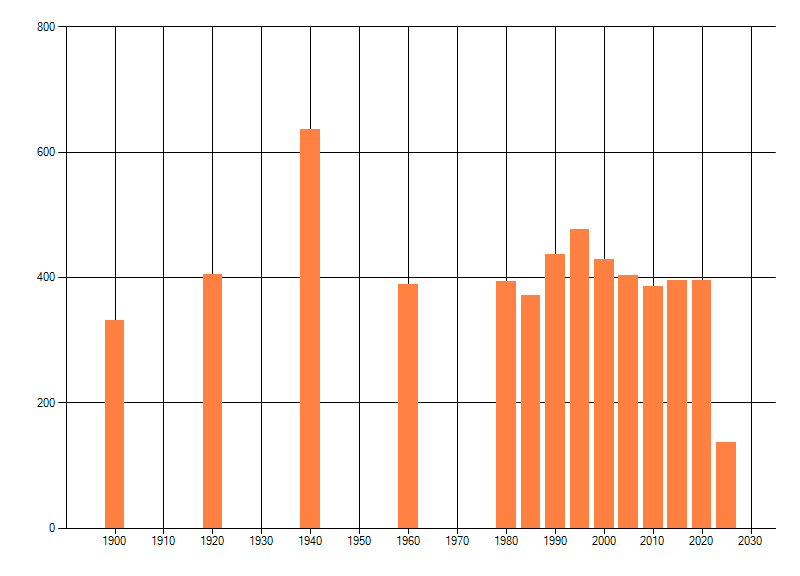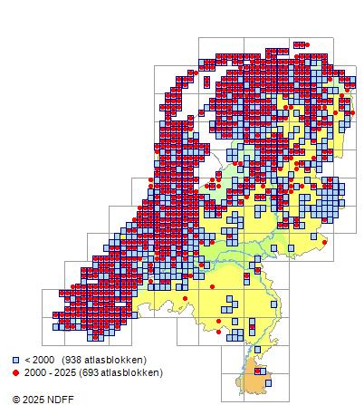 Het aantal atlasblokken (5x5 km) waarin de soort is gemeld binnen een periode van vijf jaar (vanaf 1980) of twintig jaar. Niet gecorrigeerd voor waarnemersinspanning en het aantal doorgegeven waarnemingen kan sterk variƫren per periode, dus een trend in verspreiding kan hier niet direct uit worden afgelezen. Het opgegeven jaartal is het eerste jaar van de periode. Bron: gevalideerde waarnemingen uit de NDFF.