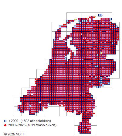 Het aantal atlasblokken (5x5 km) waarin de soort is gemeld binnen een periode van vijf jaar (vanaf 1980) of twintig jaar. Niet gecorrigeerd voor waarnemersinspanning en het aantal doorgegeven waarnemingen kan sterk variƫren per periode, dus een trend in verspreiding kan hier niet direct uit worden afgelezen. Het opgegeven jaartal is het eerste jaar van de periode. Bron: gevalideerde waarnemingen uit de NDFF.
