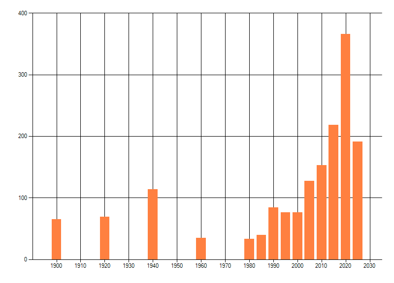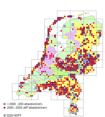 Het aantal atlasblokken (5x5 km) waarin de soort is gemeld binnen een periode van vijf jaar (vanaf 1980) of twintig jaar. Niet gecorrigeerd voor waarnemersinspanning en het aantal doorgegeven waarnemingen kan sterk variƫren per periode, dus een trend in verspreiding kan hier niet direct uit worden afgelezen. Het opgegeven jaartal is het eerste jaar van de periode. Bron: gevalideerde waarnemingen uit de NDFF.
