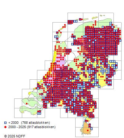 Het aantal atlasblokken (5x5 km) waarin de soort is gemeld binnen een periode van vijf jaar (vanaf 1980) of twintig jaar. Niet gecorrigeerd voor waarnemersinspanning en het aantal doorgegeven waarnemingen kan sterk variëren per periode, dus een trend in verspreiding kan hier niet direct uit worden afgelezen. Het opgegeven jaartal is het eerste jaar van de periode. Bron: gevalideerde waarnemingen uit de NDFF.