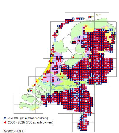 Het aantal atlasblokken (5x5 km) waarin de soort is gemeld binnen een periode van vijf jaar (vanaf 1980) of twintig jaar. Niet gecorrigeerd voor waarnemersinspanning en het aantal doorgegeven waarnemingen kan sterk variëren per periode, dus een trend in verspreiding kan hier niet direct uit worden afgelezen. Het opgegeven jaartal is het eerste jaar van de periode. Bron: gevalideerde waarnemingen uit de NDFF.