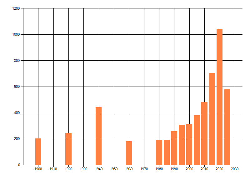 Het aantal atlasblokken (5x5 km) waarin de soort is gemeld binnen een periode van vijf jaar (vanaf 1980) of twintig jaar. Niet gecorrigeerd voor waarnemersinspanning en het aantal doorgegeven waarnemingen kan sterk variëren per periode, dus een trend in verspreiding kan hier niet direct uit worden afgelezen. Het opgegeven jaartal is het eerste jaar van de periode. Bron: gevalideerde waarnemingen uit de NDFF.