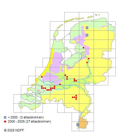 Het aantal atlasblokken (5x5 km) waarin de soort is gemeld binnen een periode van vijf jaar (vanaf 1980) of twintig jaar. Niet gecorrigeerd voor waarnemersinspanning en het aantal doorgegeven waarnemingen kan sterk variëren per periode, dus een trend in verspreiding kan hier niet direct uit worden afgelezen. Het opgegeven jaartal is het eerste jaar van de periode. Bron: gevalideerde waarnemingen uit de NDFF.