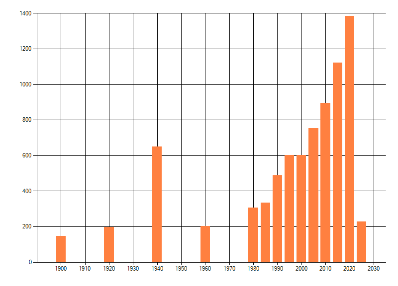 Het aantal atlasblokken (5x5 km) waarin de soort is gemeld binnen een periode van vijf jaar (vanaf 1980) of twintig jaar. Niet gecorrigeerd voor waarnemersinspanning en het aantal doorgegeven waarnemingen kan sterk variƫren per periode, dus een trend in verspreiding kan hier niet direct uit worden afgelezen. Het opgegeven jaartal is het eerste jaar van de periode. Bron: gevalideerde waarnemingen uit de NDFF.