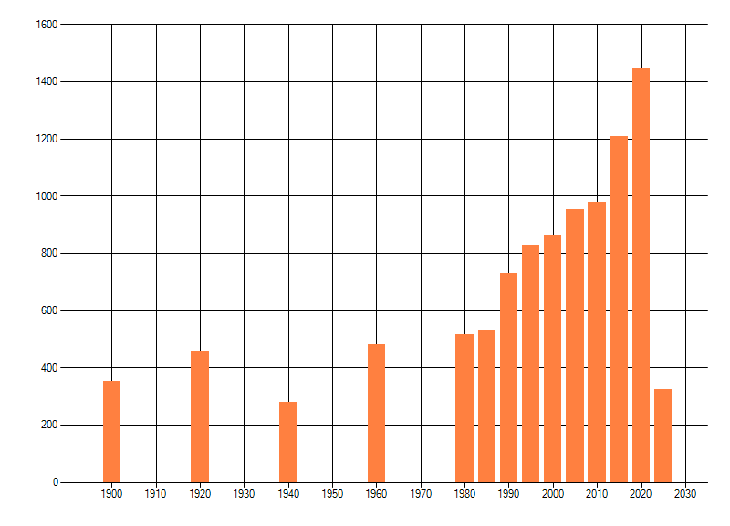 Het aantal atlasblokken (5x5 km) waarin de soort is gemeld binnen een periode van vijf jaar (vanaf 1980) of twintig jaar. Niet gecorrigeerd voor waarnemersinspanning en het aantal doorgegeven waarnemingen kan sterk variëren per periode, dus een trend in verspreiding kan hier niet direct uit worden afgelezen. Het opgegeven jaartal is het eerste jaar van de periode. Bron: gevalideerde waarnemingen uit de NDFF.