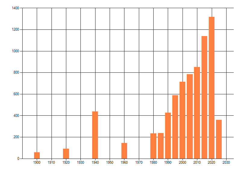 Het aantal atlasblokken (5x5 km) waarin de soort is gemeld binnen een periode van vijf jaar (vanaf 1980) of twintig jaar. Niet gecorrigeerd voor waarnemersinspanning en het aantal doorgegeven waarnemingen kan sterk variƫren per periode, dus een trend in verspreiding kan hier niet direct uit worden afgelezen. Het opgegeven jaartal is het eerste jaar van de periode. Bron: gevalideerde waarnemingen uit de NDFF.