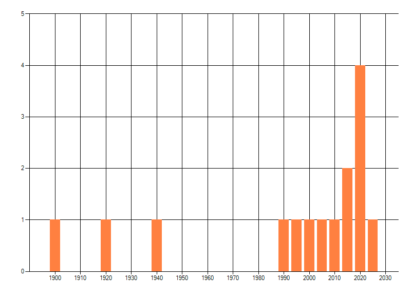 Het aantal atlasblokken (5x5 km) waarin de soort is gemeld binnen een periode van vijf jaar (vanaf 1980) of twintig jaar. Niet gecorrigeerd voor waarnemersinspanning en het aantal doorgegeven waarnemingen kan sterk variëren per periode, dus een trend in verspreiding kan hier niet direct uit worden afgelezen. Het opgegeven jaartal is het eerste jaar van de periode. Bron: gevalideerde waarnemingen uit de NDFF.