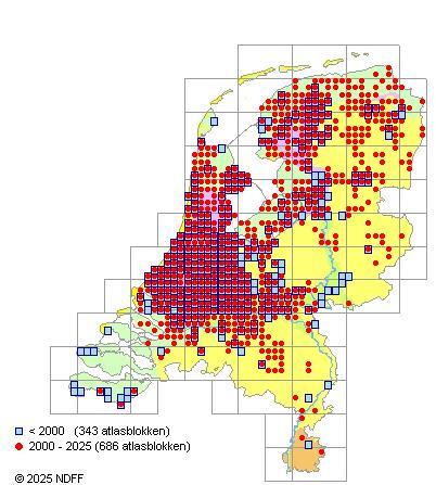 Het aantal atlasblokken (5x5 km) waarin de soort is gemeld binnen een periode van vijf jaar (vanaf 1980) of twintig jaar. Niet gecorrigeerd voor waarnemersinspanning en het aantal doorgegeven waarnemingen kan sterk variëren per periode, dus een trend in verspreiding kan hier niet direct uit worden afgelezen. Het opgegeven jaartal is het eerste jaar van de periode. Bron: gevalideerde waarnemingen uit de NDFF.