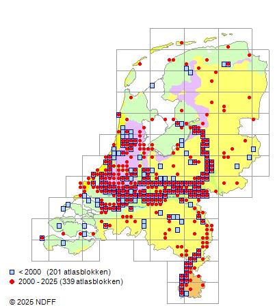 Het aantal atlasblokken (5x5 km) waarin de soort is gemeld binnen een periode van vijf jaar (vanaf 1980) of twintig jaar. Niet gecorrigeerd voor waarnemersinspanning en het aantal doorgegeven waarnemingen kan sterk variëren per periode, dus een trend in verspreiding kan hier niet direct uit worden afgelezen. Het opgegeven jaartal is het eerste jaar van de periode. Bron: gevalideerde waarnemingen uit de NDFF.