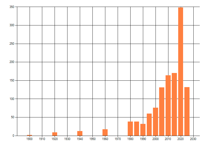 Het aantal atlasblokken (5x5 km) waarin de soort is gemeld binnen een periode van vijf jaar (vanaf 1980) of twintig jaar. Niet gecorrigeerd voor waarnemersinspanning en het aantal doorgegeven waarnemingen kan sterk variëren per periode, dus een trend in verspreiding kan hier niet direct uit worden afgelezen. Het opgegeven jaartal is het eerste jaar van de periode. Bron: gevalideerde waarnemingen uit de NDFF.