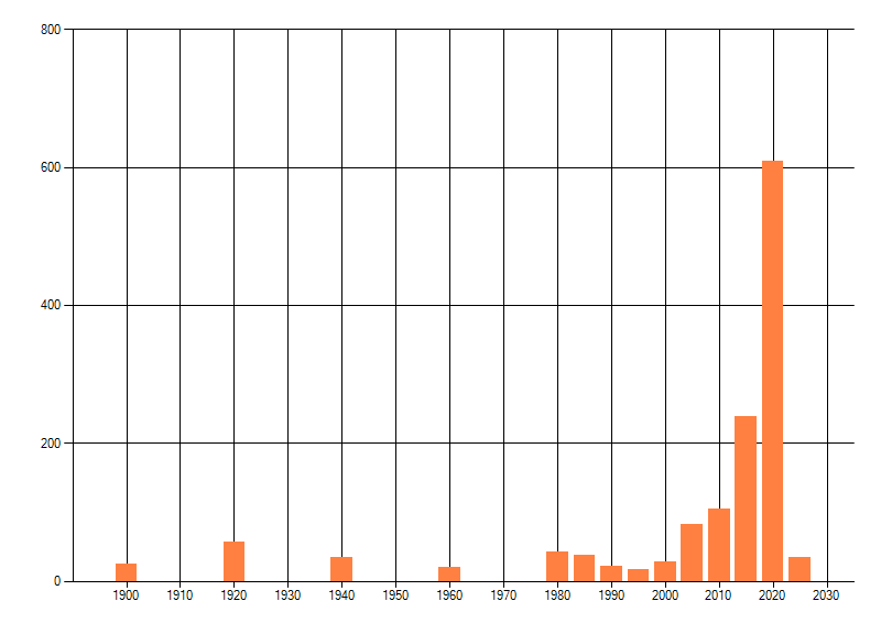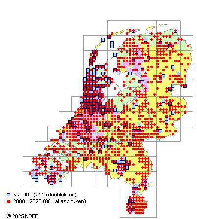 Het aantal atlasblokken (5x5 km) waarin de soort is gemeld binnen een periode van vijf jaar (vanaf 1980) of twintig jaar. Niet gecorrigeerd voor waarnemersinspanning en het aantal doorgegeven waarnemingen kan sterk variëren per periode, dus een trend in verspreiding kan hier niet direct uit worden afgelezen. Het opgegeven jaartal is het eerste jaar van de periode. Bron: gevalideerde waarnemingen uit de NDFF.