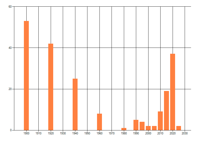 Het aantal atlasblokken (5x5 km) waarin de soort is gemeld binnen een periode van vijf jaar (vanaf 1980) of twintig jaar. Niet gecorrigeerd voor waarnemersinspanning en het aantal doorgegeven waarnemingen kan sterk variëren per periode, dus een trend in verspreiding kan hier niet direct uit worden afgelezen. Het opgegeven jaartal is het eerste jaar van de periode. Bron: gevalideerde waarnemingen uit de NDFF.